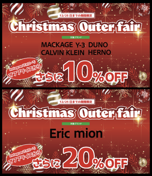 お知らせ 2025.12.15 【アウターフェアー開催中🎄】 12月25日までの期間限定で、対象ブランドのアウターがインスタフォローされている方限定でお得に!!・対象ブランドMACKAGE・Y-3・DUNO・CALVIN KLEIN・HERNOMION・ERICInstagramはこちらからも↓↓https://www.instagram.com/lil.offprice.store/お得な情報を随時更新中!!!
