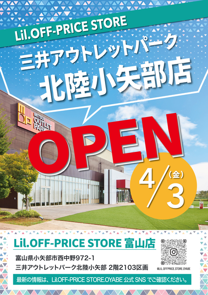 お知らせ 2026.03.27 【 オフプライスストアが富山県にて常設店OPEN 】 富山県の皆さん必見‼️👀有名ブランドがお安く買える⤵️今話題のオフプライスストアが富山県にて常設店OPEN🙌🏻数々の有名ブランドが店頭に並びます📢オープン日は4月3日予定🗓️最新の商品情報はInstagramのアカウントをフォローして、ストーリーズをチェック☑️https://www.instagram.com/lil.offprice.store.oyabe/